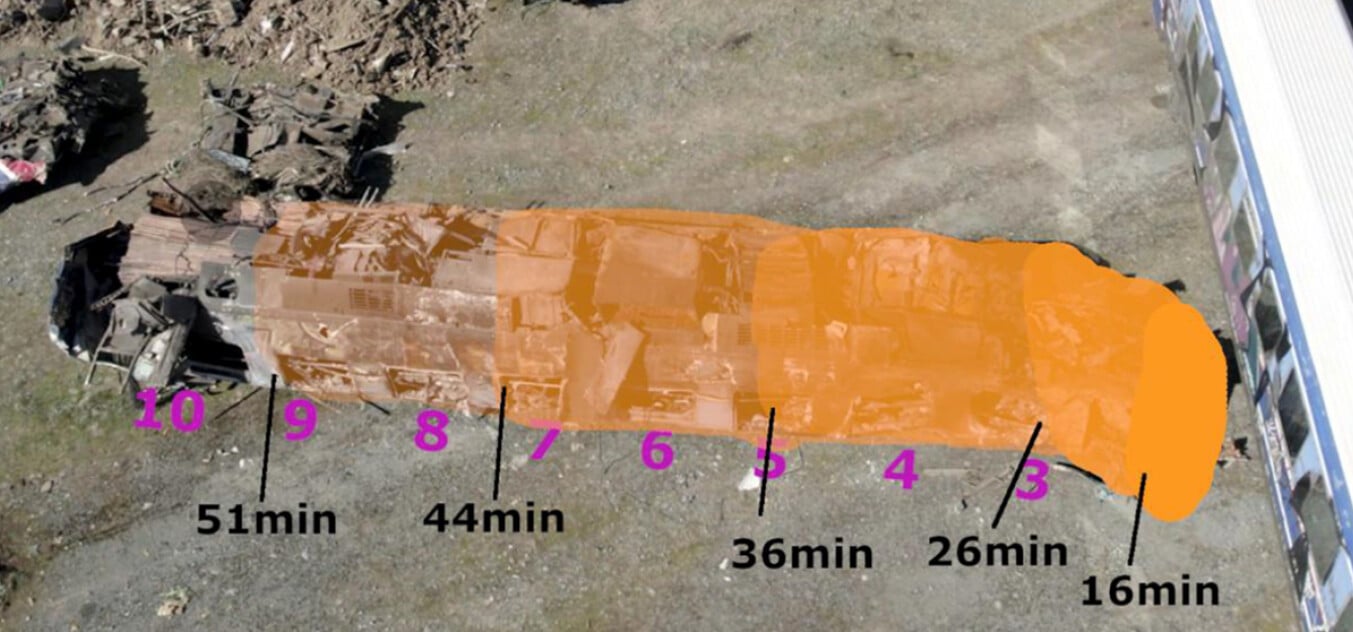 Μεταξύ άλλων αναλύεται η θέση και η κίνηση των συρμών κατά τη θανατηφόρα σύγκρουση της εμπορικής με την επιβατική αμαξοστοιχία.