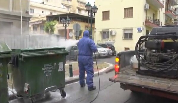 Συνεργεία κάνουν απολύμανση από το πρωί στην περιοχή της Θεσσαλονίκης που έμενε ο 35χρονος ο οποίος έχασε τη ζωή του από τον κορωνοϊό.