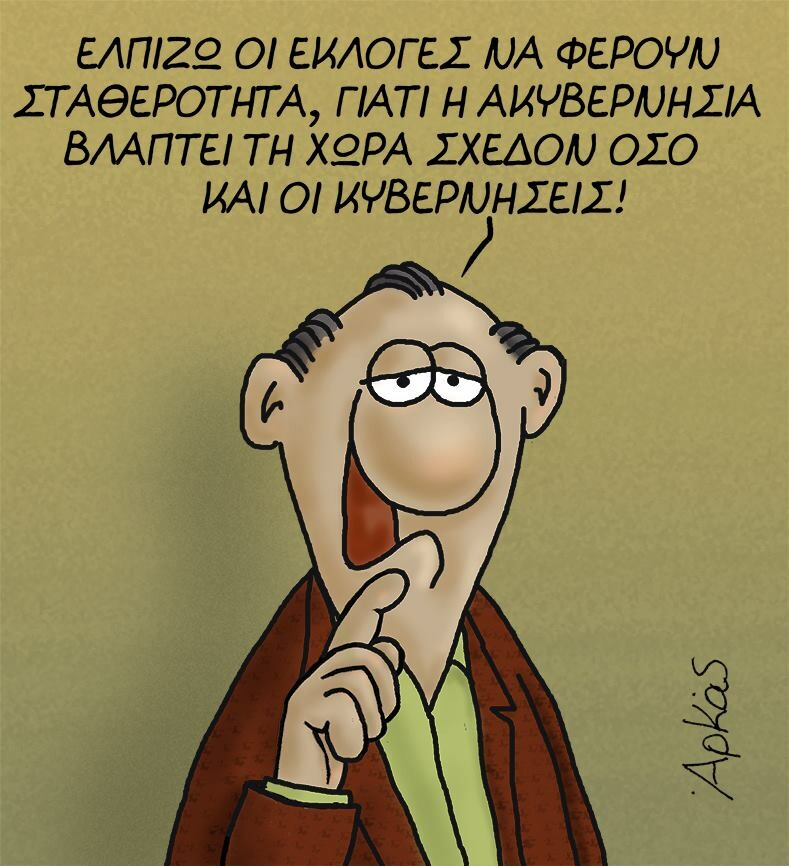 Και σήμερα "χτύπησε" ο Αρκάς, ανεβάζοντας στη σελίδα του στο Facebook ένα ακόμη αιχμηρό σκίτσο για την πολιτική πραγματικότητα. "Ελπίζω οι εκλογές να φέρουν σταθερότητα, γιατί η ακυβερνησία βλάπτει τη χώρα σχεδόν όσο και οι κυβερνήσεις", είναι το σχόλιο του Αρκά.
