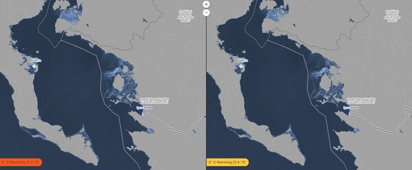 Η περιήγηση στον παραπάνω χάρτη δείχνει τι θα συμβεί σε παραθαλάσσιες περιοχές της Αττικής, αλλά και όλης της Ελλάδας αν η θερμοκρασία ανέβει κατά 4 βαθμούς ( αριστερά) και αν ανέβει 2 βαθμούς ( δεξιά).