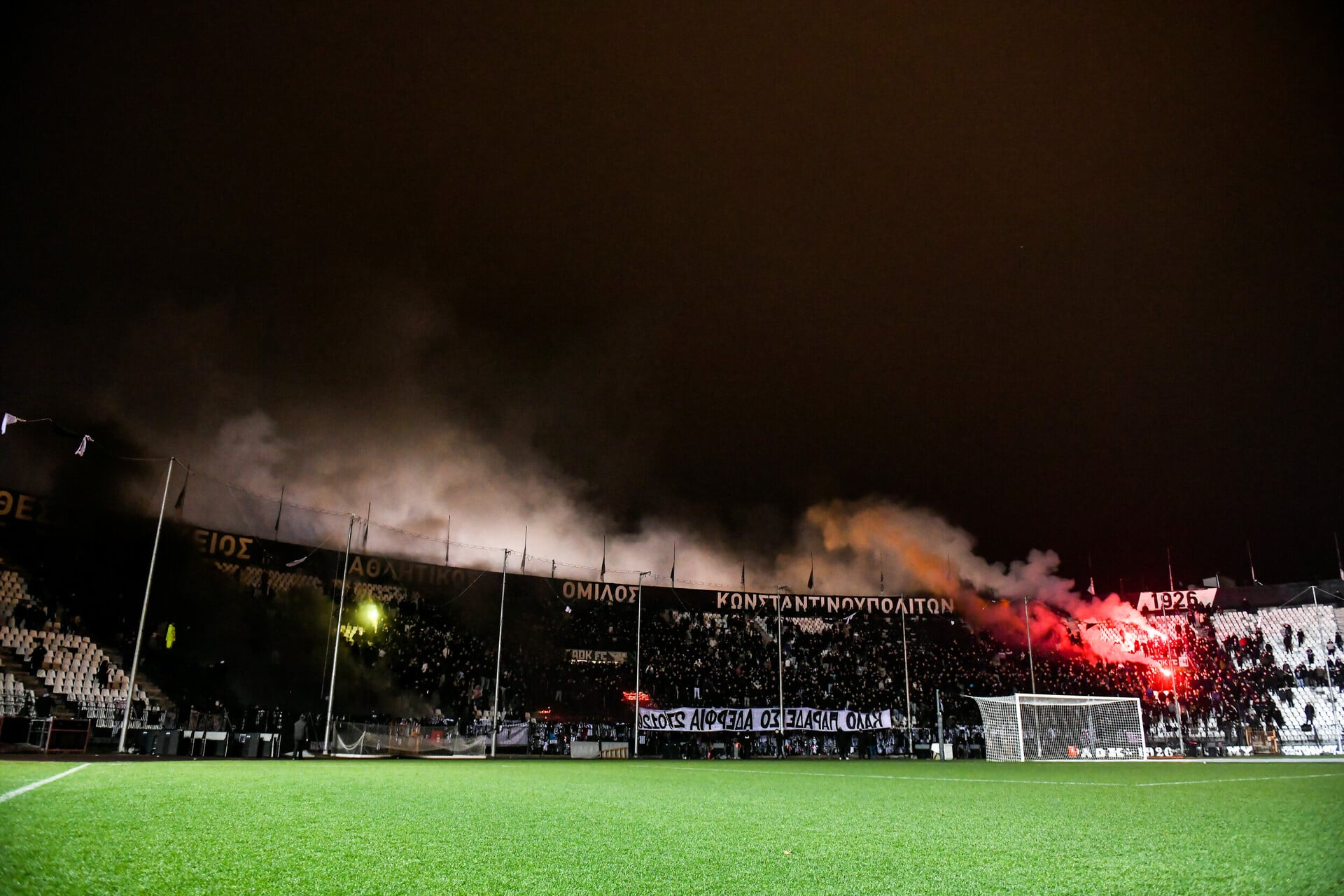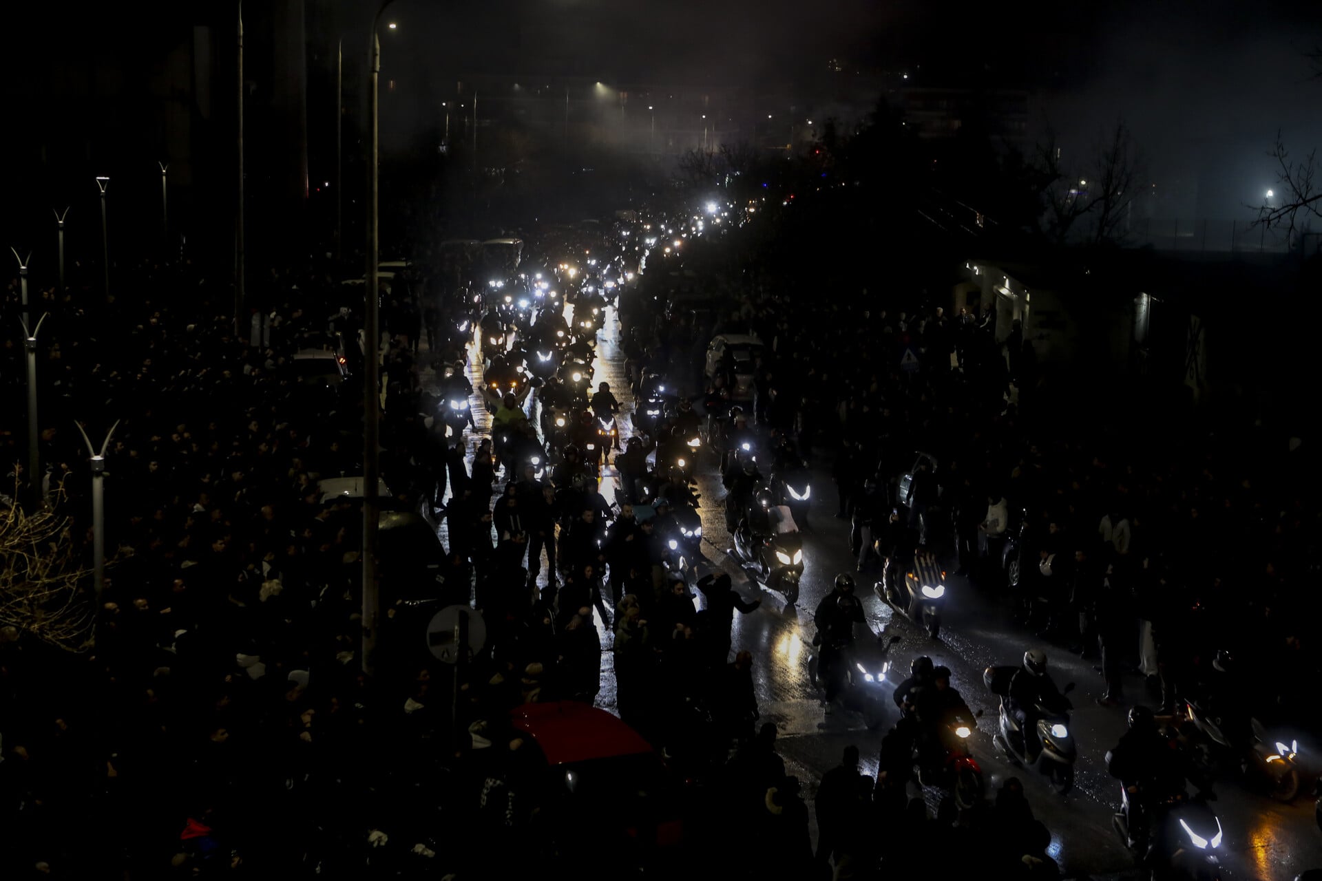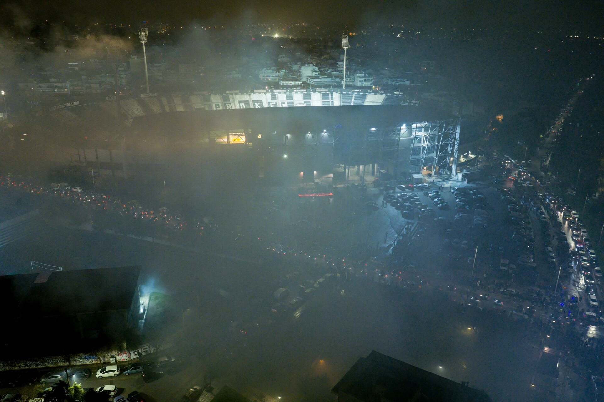 Στο γήπεδο της Τούμπας δακρυσμένοι φίλαθλοι υποδέχτηκαν τις σορούς, ανάβοντας πυρσούς.