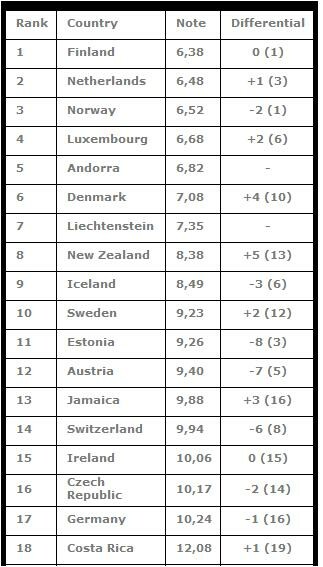 Στις πρώτες θέσεις βρίσκονται η Φινλανδία, η Νορβηγία και η Ολλανδία ενώ στις τελευταίες η Βόρεια Κορέα και η Ερυθραία.