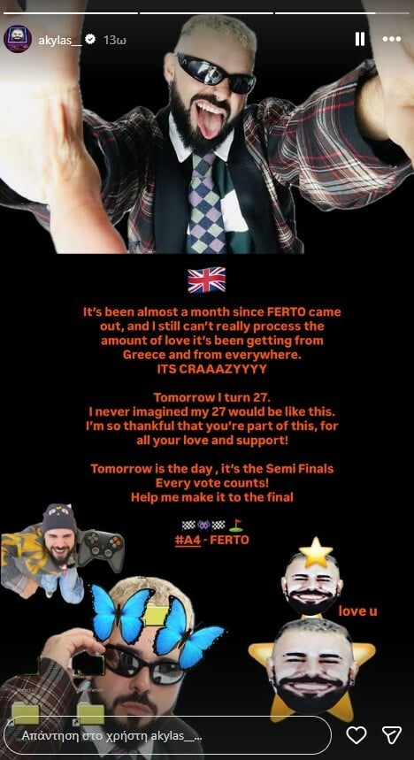 Στο ίδιο μήνυμα, ο Akylas υπενθύμισε ότι η ημέρα του ημιτελικού είναι ιδιαίτερα σημαντική, απευθύνοντας κάλεσμα στο κοινό να τον στηρίξει ώστε να προκριθεί στον τελικό: «Είναι ο Α’ ημιτελικός. Κάθε ψήφος είναι σημαντική. Βοηθήστε με το να πάμε στον τελικό. #A4 για να στο φέρω #FERTO».