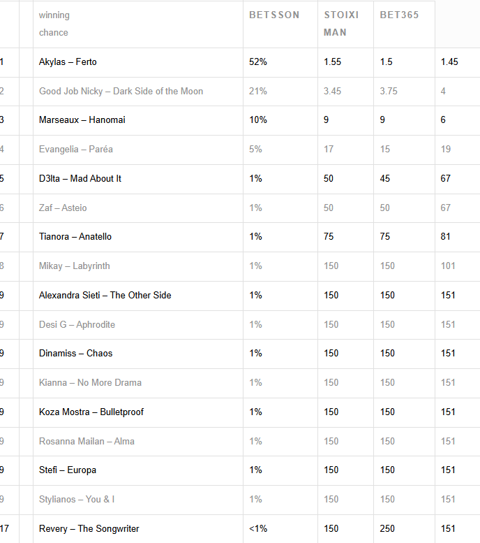 Τις τελευταίες ημέρες, μάλιστα, παρατηρούνται σημαντικές αλλαγές και στις στοιχηματικές αποδόσεις του, καθώς ο Akylas με το κομμάτι «Ferto», εμφανίζεται πλέον ως το απόλυτο φαβορί, ξεπερνώντας το όριο του 50% στις πιθανότητες νίκης.