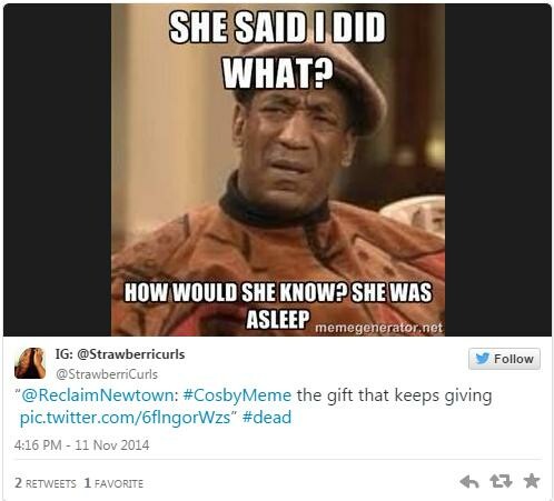 Μέσα σε όλο αυτό το αρνητικό κλίμα τη Δευτέρα ένα tweet από τον λογαριασμό @BillCosby παρακινούσε τον κόσμο να φτιάξει meme για τον ηθοποιό. Ίσως ήταν η πιο κακή ιδέα στην πιο ακατάλληλη στιγμή. Το internet εξερράγη από ιδέες, και καμία δεν ήταν στην κατεύθυνση που ήλπιζαν οι εμπνευστές της ιδέας. Ο λογαριασμός του Μπιλ Κόσμπι εξαφανίστηκε, αλλά ως γνωστόν, τίποτα δεν εξαφανίζεται από το ίντερνετ. Όταν μπει, μένει για πάντα: