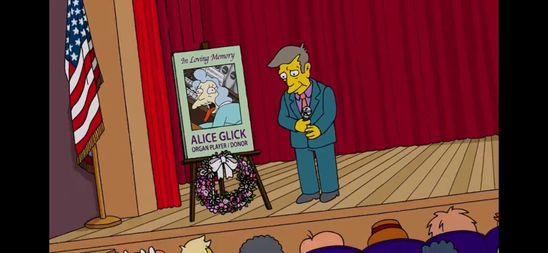 Στο τελευταίο επεισόδιο των «The Simpsons», η εκκλησιαστική οργαχοπαίκτης, Alice Glick, πέθανε ξαφνικά, και αυτή τη φορά ο φαίνεται πως ο θάνατός της θα είναι οριστικός. Η Glick, που έκανε την πρώτη της εμφάνιση το 1991 στη 2η σεζόν και όλα αυτά τα χρόνια εμφανιζόταν περιστασιακά, κατέρρευσε κατά τη διάρκεια ενός κηρύγματος στην Εκκλησία του Σπρίνγκφιλντ στο επεισόδιο «Sashes to Sashes» της 37ης σεζόν.