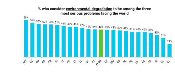 Σε ό,τι αφορά την υποβάθμιση του περιβάλλοντος, το 31% των ερωτηθέντων στην Ελλάδα τοποθετούν αυτό το ζήτημα ανάμεσα στα τρία μεγαλύτερα προβλήματα που αντιμετωπίζει η ανθρωπότητα, ποσοστό που φέρνει τη χώρα μας στην 22η θέση.