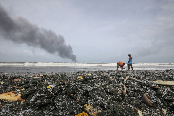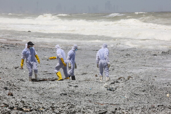 Δεκάδες άτομα του πολεμικού Ναυτικού της χώρας επιστρατεύτηκαν για τον καθαρισμό των ακτών, φορώντας ειδικές προστατευτικές στολές για τα τοξικά συντρίμμια του πλοίου.