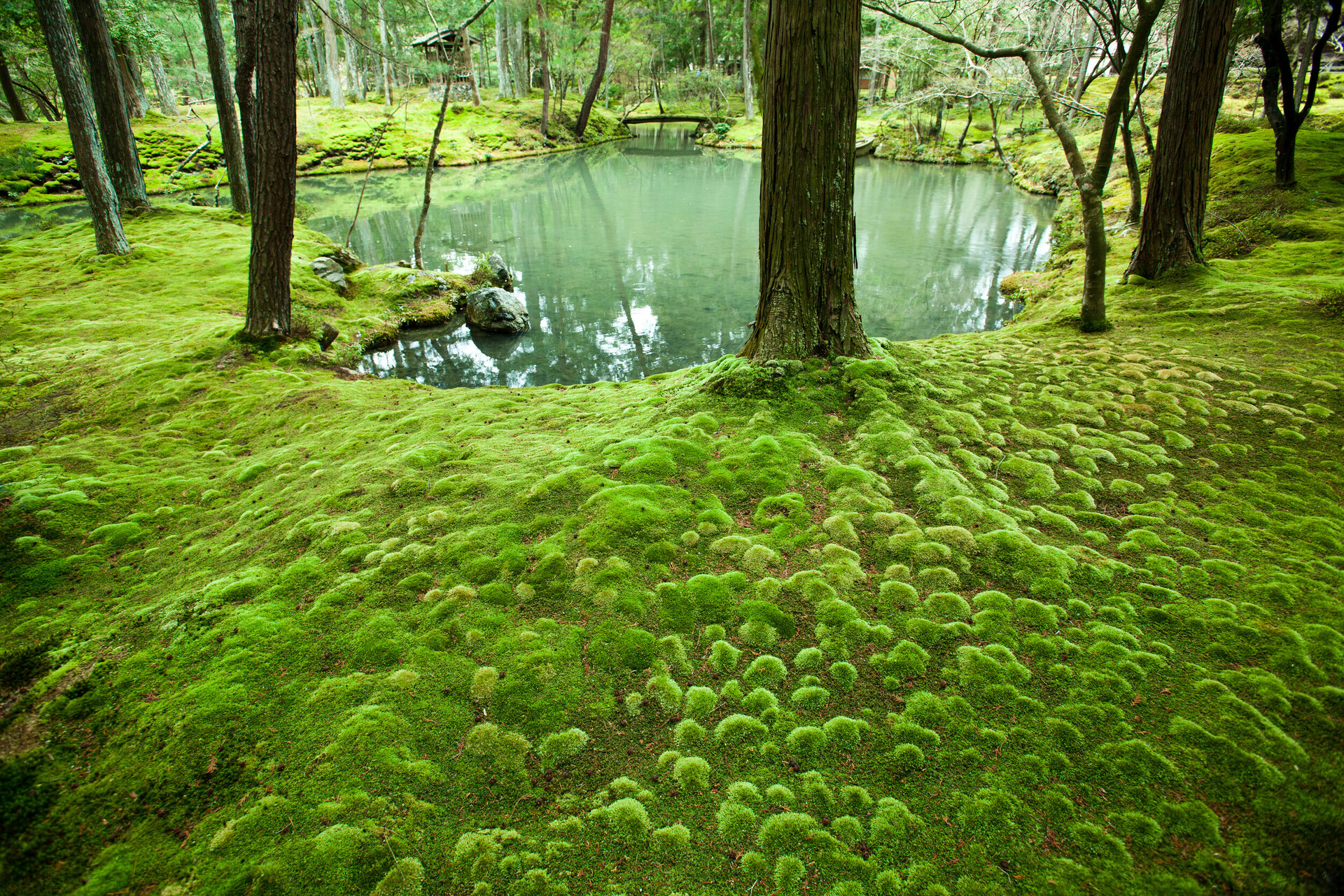 Είναι ευρύτερα γνωστός ως «Ναός των Βρύων» και είναι καταχωρημένος ως Μνημείο Παγκόσμιας Κληρονομιάς της UNESCO. Χαρακτηριστικό του κήπου είναι η πλούσια βλάστηση, με πάνω από 120 είδη από βρυόφυτα, τα οποία δημιουργούν μια μαγευτική, σχεδόν εξωπραγματική καταπράσινη ατμόσφαιρα, ιδιαίτερα εντυπωσιακή κατά τη διάρκεια της βροχερής περιόδου –από τα μέσα Ιουνίου έως τα μέσα Ιουλίου– και το φθινόπωρο, όταν τα φύλλα των σφενδάμων αποκτούν κόκκινες και πορτοκαλί αποχρώσεις. Σημειώνεται πως για να επισκεφτείτε τον κήπο, απαιτείται κράτηση μέσω της επίσημης ιστοσελίδας του ναού.