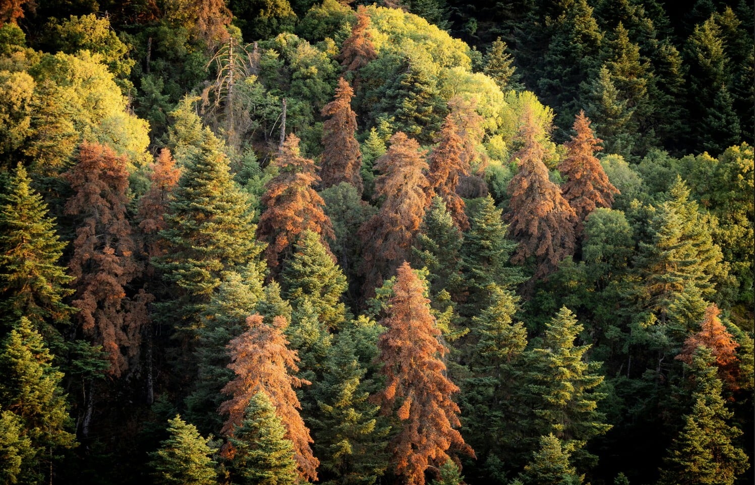 Έπειτα έρχεται το βιολογικό επακόλουθο. Τα εδάφη που έχουν υποβαθμιστεί από την ξηρασία και τα μειωμένα υπόγεια ύδατα αφήνουν τα έλατα εξασθενημένα, δημιουργώντας ευκαιρίες για τα έντομα. «Ξέρουμε ότι η έντονη ξηρασία αποδυναμώνει τα δέντρα», εξηγεί ο Δρ Αβτζής.