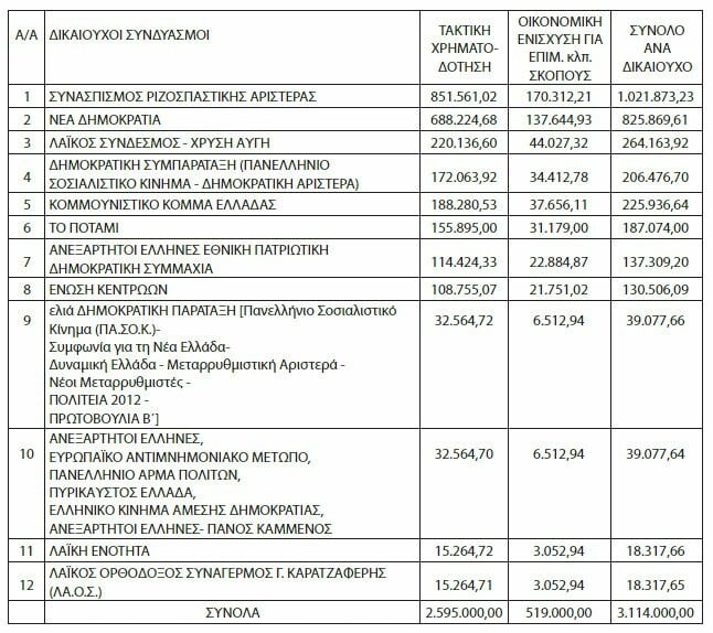 Στα 3.114.000 ευρώ ανέρχεται η κρατική χρηματοδότηση για τα πολιτικά κόμματα.