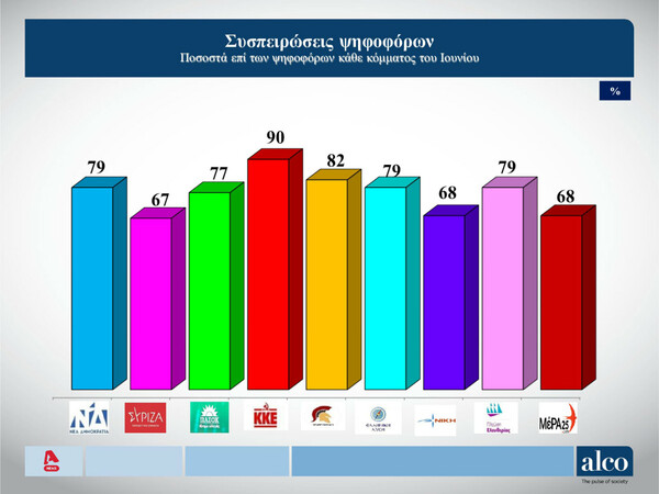 Χαρακτηριστικό είναι ότι ο ΣΥΡΙΖΑ καταγράφει το χαμηλότερο ποσοστό συσπείρωσης των ψηφοφόρων ενώ αντίθετα το ΚΚΕ, παραδοσιακά, μετά από εκλογές, όπως σημειώνει η δημοσκόπηση, το μεγαλύτερο.