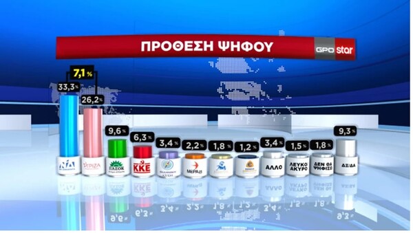 Στις 7,1 μονάδες διαμορφώνεται η διαφορά της Νέας Δημοκρατίας από τον ΣΥΡΙΖΑ, σύμφωνα με νέα δημοσκόπηση της GPO για λογαριασμό του Star, με δυο βασικά κριτήρια στην πρόθεση ψήφου.