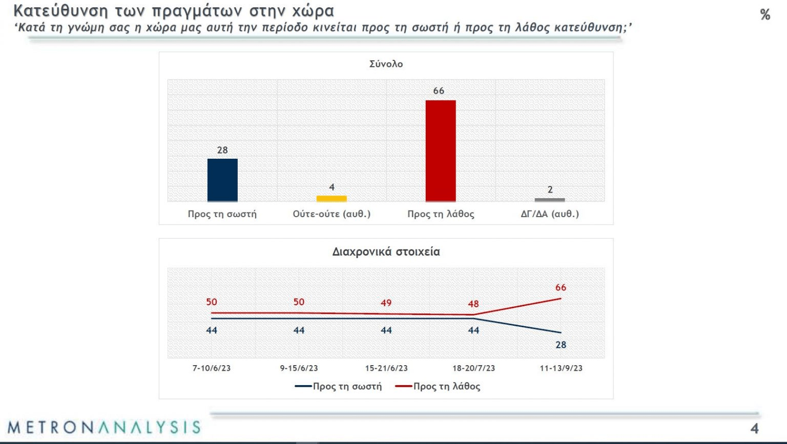 Ενδεικτικά, στην ίδια ερώτηση σε αντίστοιχη έρευνα της Metron Analysis που είχε πραγματοποιηθεί στις 19-20 Ιουλίου, το 48% υποστήριζε ότι τα πράγματα πάνε προς τη λάθος κατεύθυνση και το 44% ότι πάνε προς τη σωστή.