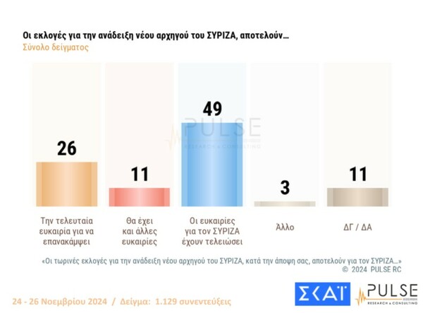 Στην ερώτηση για το τι αποτελούν οι εκλογές για την ανάδειξη νέου αρχηγού του ΣΥΡΙΖΑ, το 49% πιστεύει ότι οι ευκαιρίες για το κόμμα έχουν τελειώσει, το 26% θεωρεί ότι είναι μια τελευταία ευκαιρία για να επανακάμψει και το 11% απαντά ότι το κόμμα θα έχει και άλλες ευκαιρίες.
