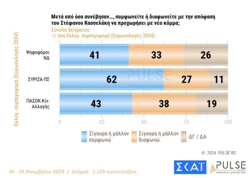 Σχετικά με την απόφαση του Στέφανου Κασσελάκη να ιδρύσει νέο κόμμα, το «Κίνημα Δημοκρατίας» το 38% συμφωνεί με την απόφαση αυτή να προχωρήσει στην ίδρυση νέου κόμματος ενώ το 35% διαφωνεί. Παράλληλα, το 75% των ερωτηθέντων απάντησε πως θεωρεί λίγο έως καθόλου πιθανό να ψηφίσει το νέο κόμμα του Στέφανου Κασσελάκη ενώ μόλις το 11% το θεωρεί πιθανό ή αρκετά πιθανό. Το 8% υποστηρίζει πως το βρίσκει λίγο πιθανό να το ψηφίσει ενώ το 7% μέτρια πιθανό.