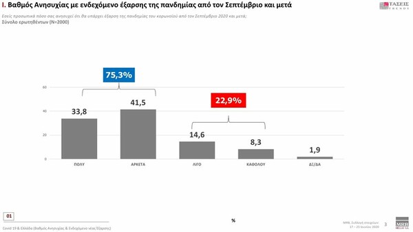 Η πανδημία του Covid -19 έχει αφήσει βαθιά σημάδια στην ζωή της χώρας, όπως και στις υπόλοιπες χώρες του κόσμου. Ως προς το υγειονομικό σκέλος της πανδημίας, το 75,3% των ερωτηθέντων φοβάται μια έξαρση της πανδημίας στο επόμενο χρονικό διάστημα, ενώ το 63,4% ανησυχεί με την πιθανότητα να ασθενήσει προσωπικά ή να ασθενήσει κάποιο μέλος της οικογένειας, κυρίως ηλικιωμένοι.