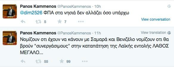 Ο Πρόεδρος των ΑΝΕΛ που σήμερα έχει προγραμματίσει και σύγκλιση της Κ.Ο. του κόμματος του για τις εξελίξεις έδωσε το «πρόσταγμα» με δύο tweet, προαναγγέλλοντας αντίδραση αν υπάρξει αύξηση των συντελεστών του ΦΠΑ στα νησιά  ενώ σημειώνει επίσης ότι οι πιστωτές δεν θα βρούν «Σαμαράδες και Βενιζέλους».
