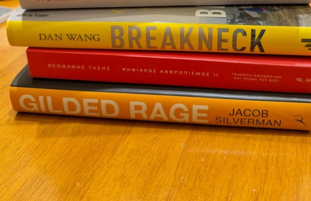 Στη κορυφή των βιβλίων που φαίνονται στη φωτογραφία βρίσκεται το «14 Σκιές και αλήθειες της Ελλάδας», το βιβλίο που παρουσίασαν πρόσφατα ο Σταύρος Θεοδωράκης με τον Άρη Βουρβούλια.