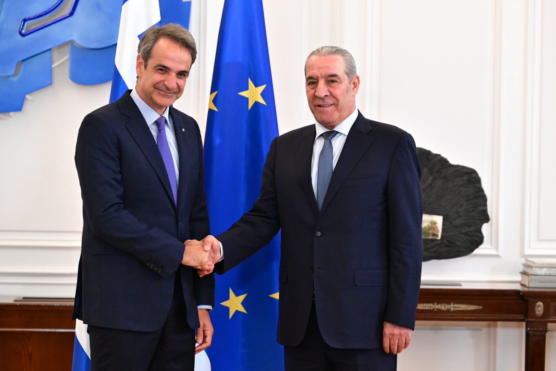 Ο Κυριάκος Μητσοτάκης συναντήθηκε σήμερα στο Μέγαρο Μαξίμου με τον αντιπρόεδρο της Παλαιστινιακής Αρχής, Χουσεΐν αλ-Σεΐχ, με αντικείμενο τις τελευταίες εξελίξεις στο Ιράν και ευρύτερα στη Μέση Ανατολή.
