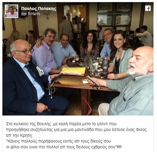 Την προκλητική φωτογραφία ανάρτησε στην προσωπική του σελίδα στο Facebook ο Παύλος Πολάκης ο οποίος διακρίνεται να κάθεται μαζί με στελέχη του ΣΥΡΙΖΑ στο καφενείο της Βουλής, ενώ μπροστά τους βρίσκεται ένα τασάκι με δύο αναμμένα τσιγάρα.