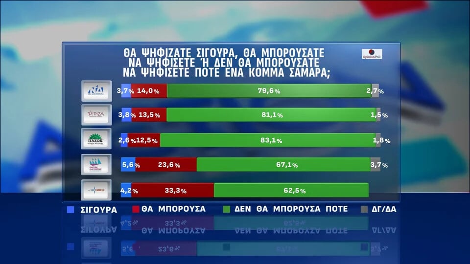 Αντίστοιχα, για το σενάριο νέου κόμματος υπό τον Αντώνη Σαμαρά, το 3,5% δηλώνει ότι θα τον ψήφιζε «σίγουρα» και άλλο ένα 16,9% το θεωρεί πιθανό.