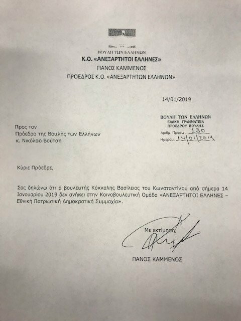 Ωστόσο η παραίτηση του κ. Κόκκαλη πρωτοκολλήθηκε σήμερα, στις 14 Ιανουαρίου, την ίδια δηλαδή ημέρα που πρωτοκολλήθηκε και η επιστολή του Πάνου Καμμένου προς τον πρόεδρο της Βουλής Νίκου Βούτση, με την οποία γνωστοποιούσε ότι ο υφυπουργούς δεν ανήκει πλέον στην ΚΟ του κόμματος.