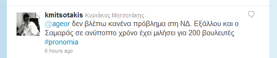 Κι ο Κυριάκος όμως δεν άφησε να πέσουν κάτω οι προκλήσεις. Μίλησε για υποκριτές και τζάμπα μάγκες και έκανε ρελάνς με το πόθεν έσχες του, λέγοντας ότι από τότε που μπήκε στη Βουλή είναι μικρότερο, σα νά' λεγε “ελάτε να τα μετρήσουμε”. Σήμερα το μεσημέρι μάλιστα ο Κυριάκος κάλεσε τους χρήστες του Twitter σε κουβέντα για τα προνόμια, όπου είπε πολύ ενδιαφέροντα πράγματα, όπως ότι θα ανεβάσει στο σάιτ του, το πόθεν έσχες και τις προσλήψεις που έχει κάνει, αναρωτώμενος πόσοι άλλοι θα το τολμήσουν.