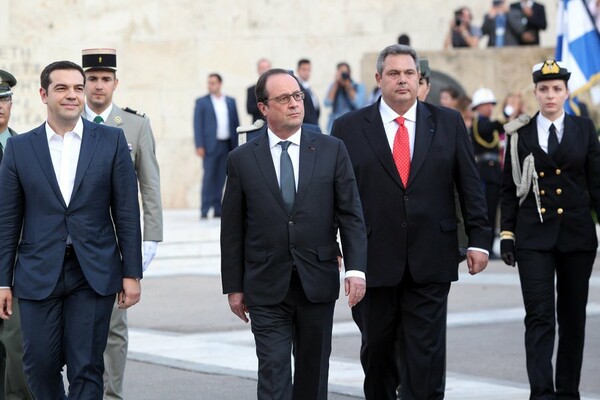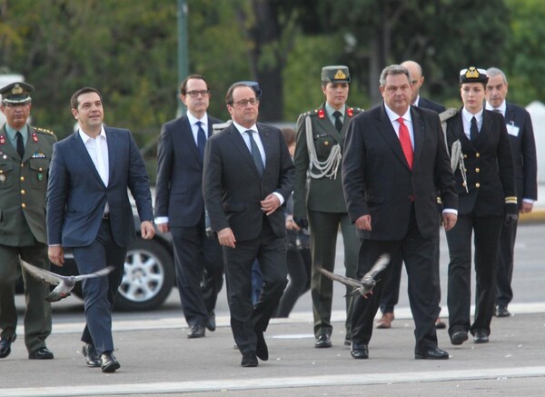 Ο Γάλλος πρόεδρος έφτασε στο μνημείο του Αγνωστου Στρατιώτη κατευθείαν απο το αεροδρόμιο συνοδευόμενος απο τον πρωθυπουργό. Στο μνημείο τον υποδέχθηκε ο υπουργός Αμυνας Πάνος Καμμένος. Στον πρόεδρο της Γαλλικής Δημοκρατίας αποδόθηκαν τιμές αρχηγού κράτους απο άγημα των τριών κλάδων των Ενόπλων Δυνάμεων. Στη συνέχεια κατέθεσε στέφανο και τήρησε ενός λεπτού σιγή. Η Φιλαρμονική του Πολεμικού Ναυτικού ανέκρουσε τους εθνικούς ύμνους των δύο χωρών και στη συνέχεια ο κ. Ολάντ επιθεώρησε το άγημα μαζί με τον πρωθυπουργό και αποχώρησε για το Προεδρικό Μέγαρο.