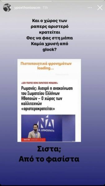 Όλα ξεκίνησαν όταν ράπερ κοινοποίησε μια ανάρτηση του Νίκου Ρωμανού, στην οποία ανέφερε ότι ο χώρος των καλλιτεχνών αριστεροκρατείται και σε story του έγραφε: «και ο χώρος των ράπερ αριστεροκρατείται. Θες να φας στη μάπα καμία χρύση από glock?».
