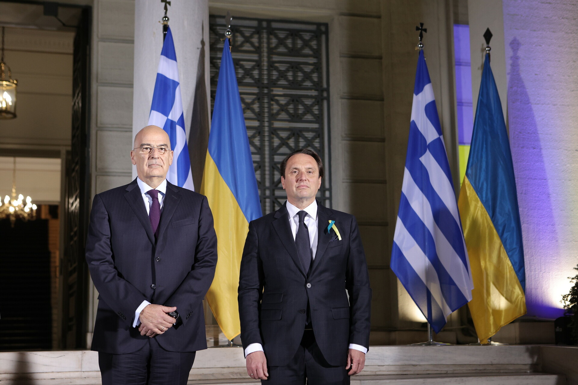 Με φόντο το φωταγωγημένο κτήριο και πλαισιωμένος από τα αριστερά του με τον πρεσβευτή της Ουκρανίας στην Ελλάδα Σεργκέι Σουτένκο και από τα δεξιά του με επικεφαλής διπλωματικών αντιπροσωπειών στην Ελλάδα, όπως των πρεσβευτών της Γερμανίας, της Μεγάλης Βρετανίας, ο Νίκος Δένδιας έστειλε μήνυμα αλληλεγγύης στον ουκρανικό λαό, υπογραμμίζοντας πως η Ελλάδα από την πρώτη μέρα στέκεται δίπλα στην Ουκρανία και ότι ο πόλεμος πρέπει να σταματήσει πριν χαθούν περισσότερες ζωές.