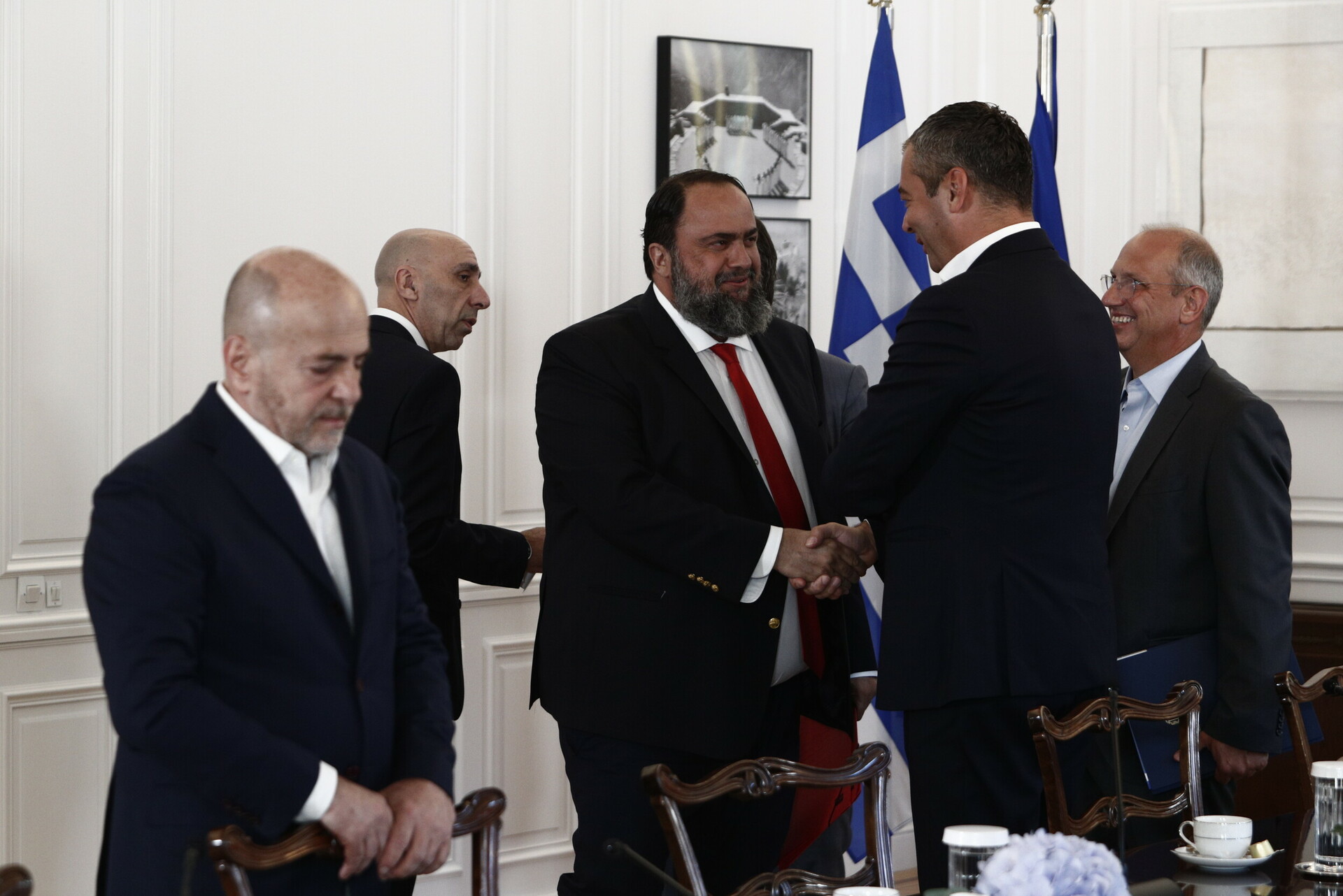 Δημήτρης Μελισσανίδης, Βαγγέλης Μαρινάκης, Γιάννης Αλαφούζος και ο Αρτούρ Νταβιντιάν, άμεσος συνεργάτης του Ιβάν Σαββίδη, βρέθηκαν στο Μέγαρο Μαξίμου για την ευρεία σύσκεψη υπό τον πρωθυπουργό Κυριάκο Μητσοτάκη με τον πρόεδρο της UEFA, Αλεξάντερ Τσέφεριν, μετά τα επεισόδια στη Νέα Φιλαδέλφεια.