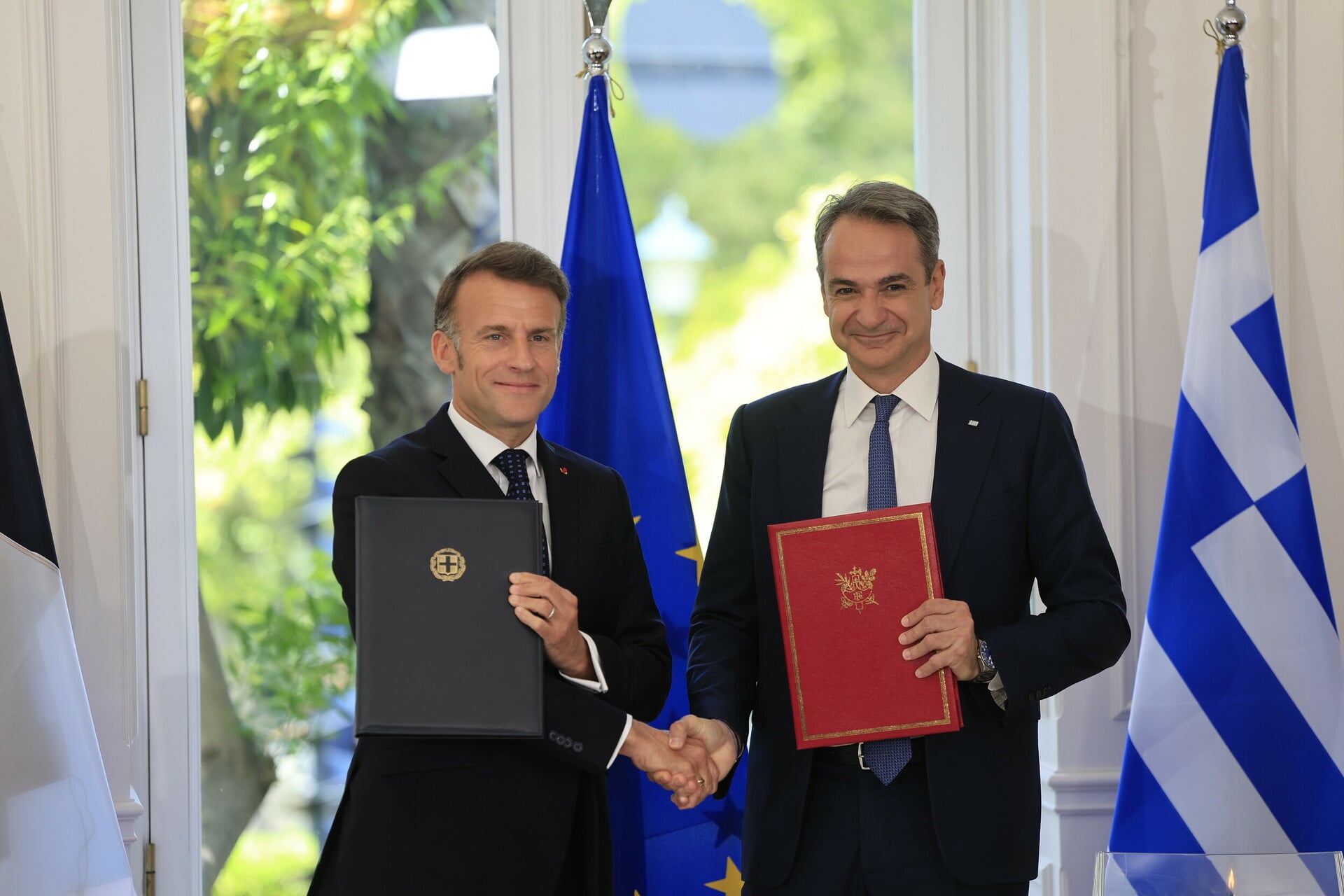 Οι δύο ηγέτες προχώρησαν σε δηλώσεις λίγο πριν από την υπογραφή διμερών συμφωνιών στρατηγικής σημασίας, οι οποίες εκτιμάται ότι θα ενισχύσουν περαιτέρω τον ρόλο Ελλάδας και Γαλλίας στην ευρωπαϊκή αρχιτεκτονική ασφάλειας και συνεργασίας.