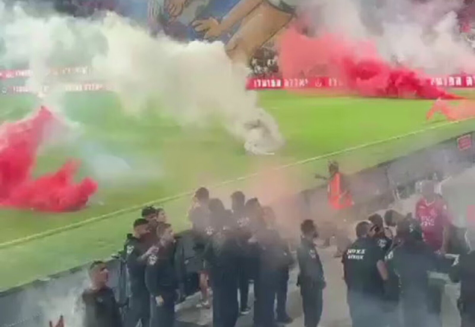 At the stadium in Tel Aviv, the #football field was pelted with smoke bombs and pyrotechnics.