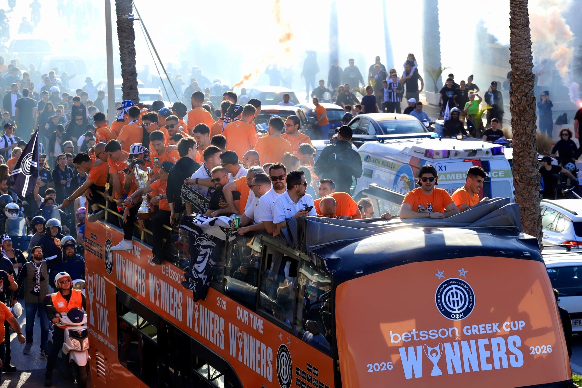 Οι ποδοσφαιριστές, το τεχνικό τιμ και η διοίκηση του ΟΦΗ με επικεφαλής τον ιδιοκτήτη της ομάδας, Μιχάλη Μπούση γιόρτασαν μαζί με χιλιάδες φιλους της ομάδας οι οποίοι κατέκλυσαν τους δρόμους για να αποθεώσουν τους πρωταγωνιστές που οδήγησαν την κρητική ομάδα στην κατάκτηση του δεύτερου Κυπέλλου της Ιστορίας της και πρώτου μετά το 1987.