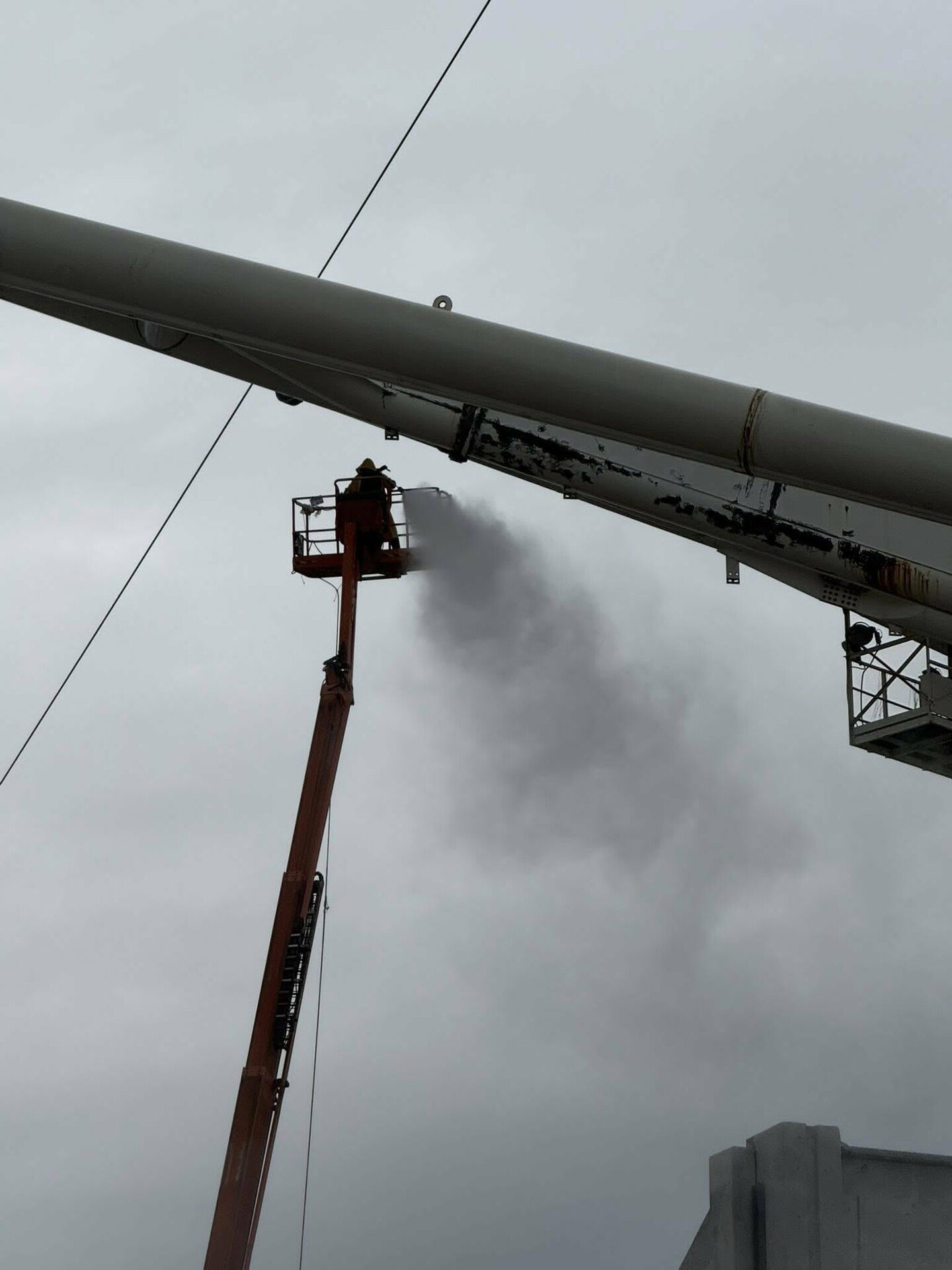 Παράλληλα, έχουν ξεκινήσει οι εργασίες υδροβολής στο κυρίως σώμα του στεγάστρου «Καλατράβα». Η διαδικασία περιλαμβάνει υδροβολή υψηλής πίεσης (Ultra High Pressure Water Jetting) με πίεση έως 2.500 bar, για την πλήρη απομάκρυνση παλαιών επιστρώσεων, οξειδώσεων και ρύπων από τις μεταλλικές επιφάνειες.