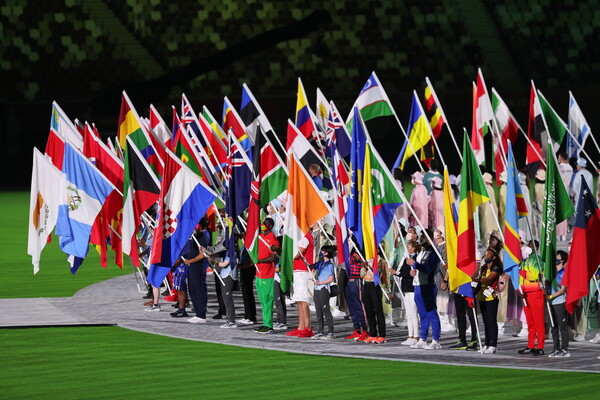 Οι αποστολές των χωρών μπήκαν όλες μαζί στο Στάδιο, με την ιαπωνική σημαία να είναι δίπλα στην ελληνική.