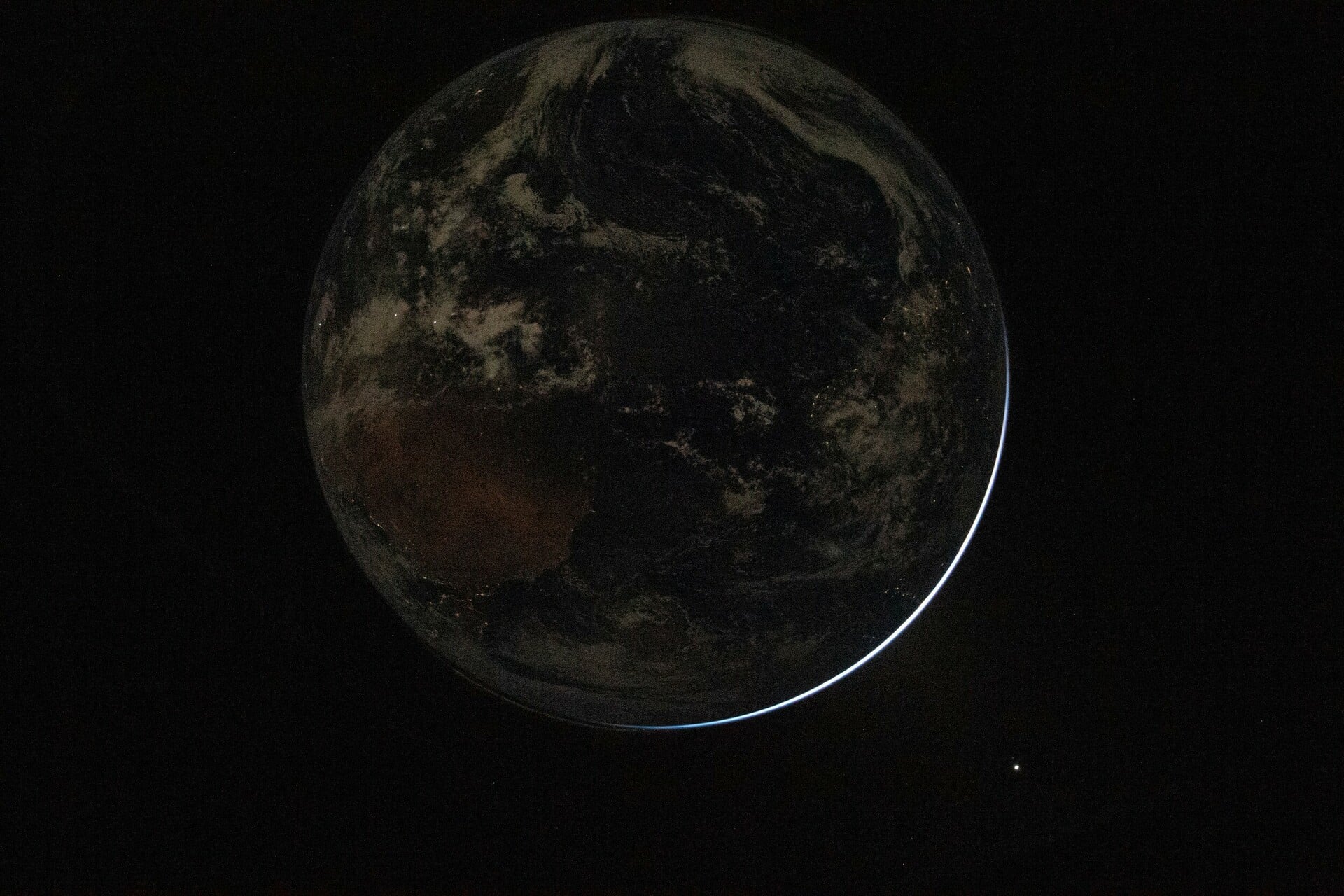 Στην τέταρτη φωτογραφία «διακρίνονται τα φώτα της ανθρώπινης δραστηριότητας. Στην κάτω δεξιά γωνία, το φως του ήλιου φωτίζει το άκρο του πλανήτη», εξηγεί η NASA.
