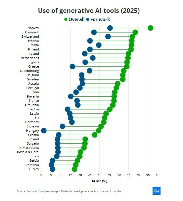 Μάλιστα, λιγότεροι από τους μισούς τα χρησιμοποίησαν για επαγγελματικούς σκοπούς, ανεβάζοντας το ποσοστό στο 15%. Η χρήση της τεχνητής νοημοσύνης στην εργασία ποικίλλει σημαντικά σε όλη την Ευρώπη.