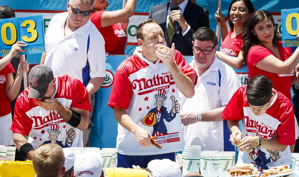 Μέχρι την δεκαετία του 1990, η συμμετοχή διαγωνιζομένων από την Ιαπωνία είχε αλλάξει εντελώς το τοπίο. Το 2001, ο Takeru Kobayashi, κατάφερε να φάει 50 χοτ ντογκ, καταρρίπτοντας το προηγούμενο ρεκόρ των λίγο παραπάνω από 25. «Δεν συμμετείχαν πλέον απλώς άνθρωποι με μεγάλη όρεξη», λέει ο Smoliga.