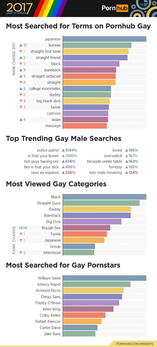Σύμφωνα με τα στοιχεία των σελίδων του Pornhub Gay, οι στατιστικές διαπίστωσαν πως το είδος του γκέι προνοστάρ που ήταν δημοφιλέστερο μέσα στο 2017 ήταν το «japanese» κι αμέσως μετά το «korean».