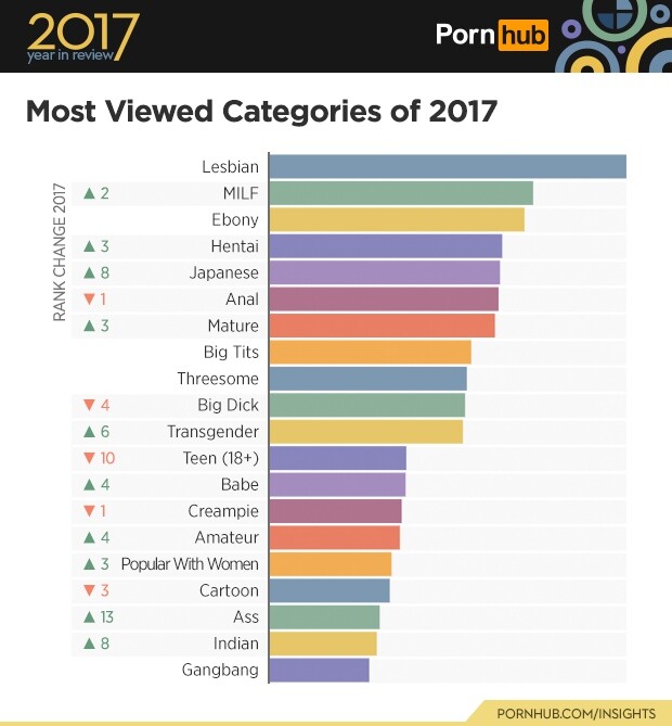 Το 2017 ήταν η τρίτη συνεχόμενη χρονιά που η κατηγορία «Lesbian» βρέθηκε στην πρώτη θέση των αναζητήσεων. Αμέσως μετά ακολουθούν σε δημοφιλία τα «MILF» και «Hentai», ενώ την έκπληξη στην φετινή λίστα έκαναν οι κατηγορίες «Indian» και «Japanese» που ανέβηκαν αρκετές θέσεις.