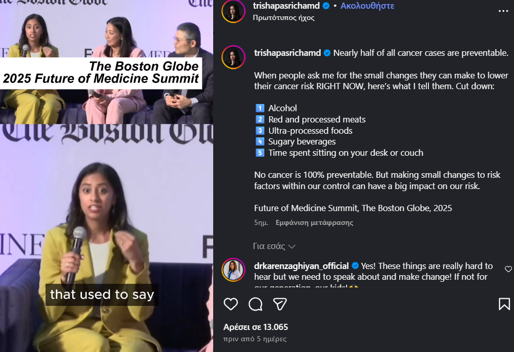 Καλεσμένη σε συνέδριο της Boston Globe, η Trisha Pasricha εξήγησε, ότι πολλοί από τους ασθενείς της, ζητούν τη συμβουλή της για να μειώσουν τις πιθανότητες να εμφανίσουν καρκίνο.