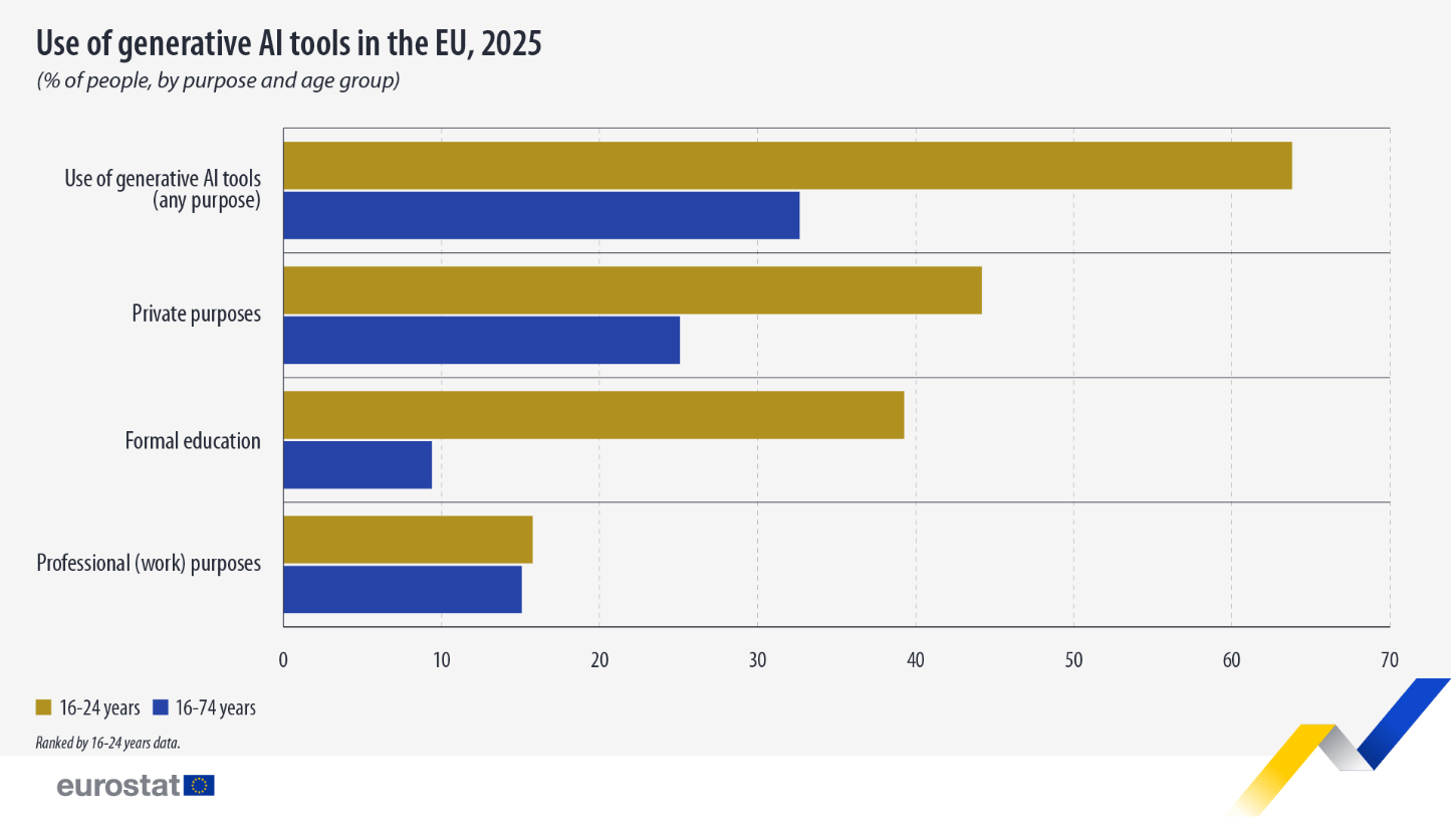 Σε επίπεδο ΕΕ, το 63,8% των νέων ηλικίας 16-24 ετών χρησιμοποίησε εργαλεία γενετικής AI το 2025. Το ποσοστό αυτό είναι σχεδόν διπλάσιο σε σχέση με τον γενικό πληθυσμό ηλικίας 16-74 ετών, όπου το αντίστοιχο ποσοστό ήταν 32,7%.