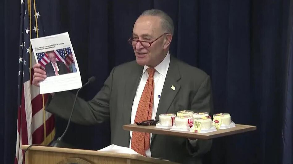 Με ένα πιατάκι με τσιζκέικ στο χέρι, ο ηγέτης των Δημοκρατικών στη Γερουσία, Τσακ Σούμερ δήλωσε «ένοχος» στην «κατηγορία» πως την τελευταία δεκαετία έχει ξοδέψει πάνω από 8.600 δολάρια στο τσιζκέικ.