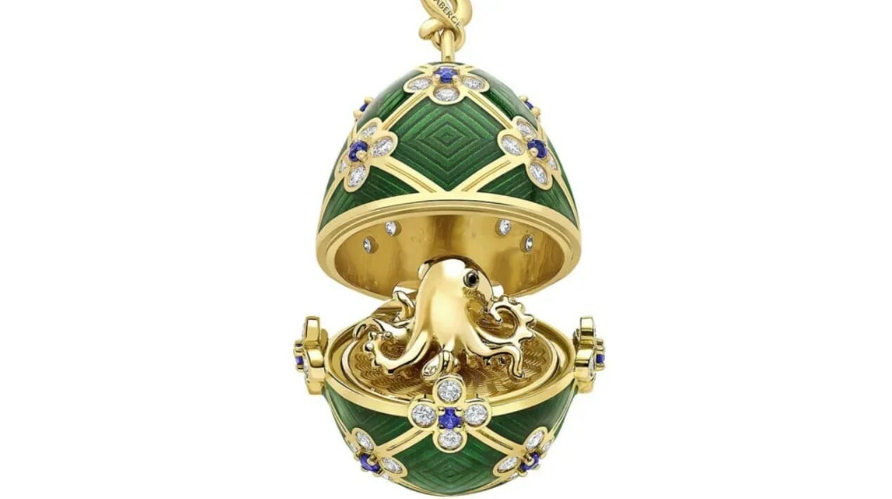 Το φερόμενο ως κλεμμένο αυγό Φαμπερζέ είναι διακοσμημένο με 60 λευκά διαμάντια και 15 μπλε ζαφείρια, σύμφωνα με την ιστοσελίδα του κοσμηματοπωλείου, και ανοίγει για να αποκαλύψει ένα  χταπόδι - μινιατούρα από χρυσό 18 καρατίων.