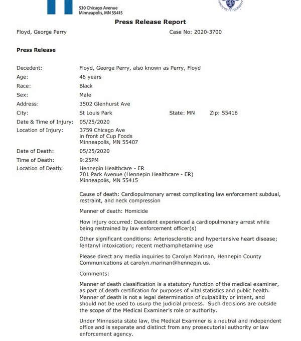 «Υπέστη καρδιακοπνευμονική ανακοπή ενώ ήταν ακινητοποιημένος από αστυνομικό ή αστυνομικούς», ανέφερε σε ανακοίνωση το γραφείο του ιατροδικαστή της κομητείας Χένεπιν. Ακόμη, η ιατροδικαστική έκθεση αναφέρει ότι ο Φλόιντ είχε υπέρταση, όπως και ότι πρόσφατα είχε κάνει χρήση φαιντανύλης και αμφεταμινών.