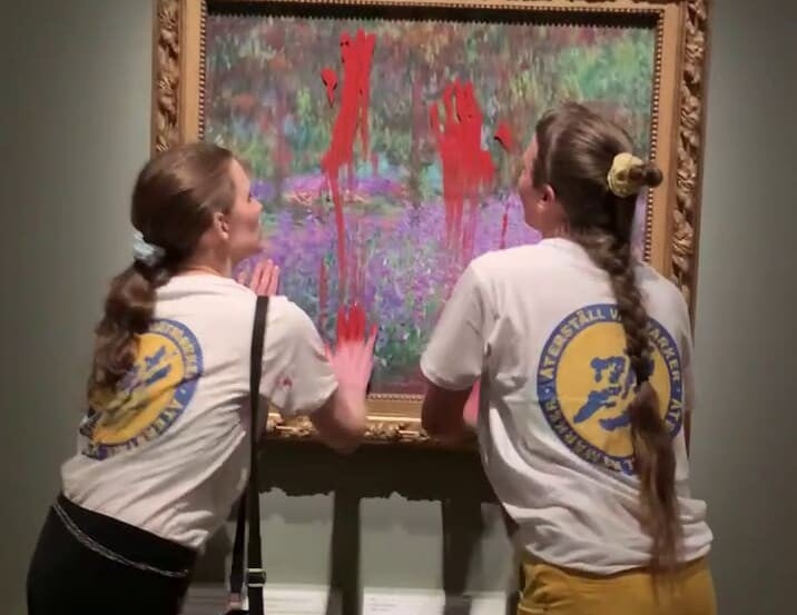 Το περιστατικό σημειώθηκε στις 14 Ιουνίου 2023 στο Nationalmuseum της Στοκχόλμης, όπου εκείνη την περίοδο εκτίθετο το έργο «Ο κήπος του καλλιτέχνη στο Ζιβερνί» (1900), δανεισμένο από το Μουσείο Ορσέ, στο πλαίσιο έκθεσης αφιερωμένης στη φύση και τους κήπους. Δύο νεαρές γυναίκες βούτηξαν τα χέρια τους σε κόκκινη μπογιά και την άπλωσαν στη γυάλινη προθήκη που προστάτευε τον πίνακα.