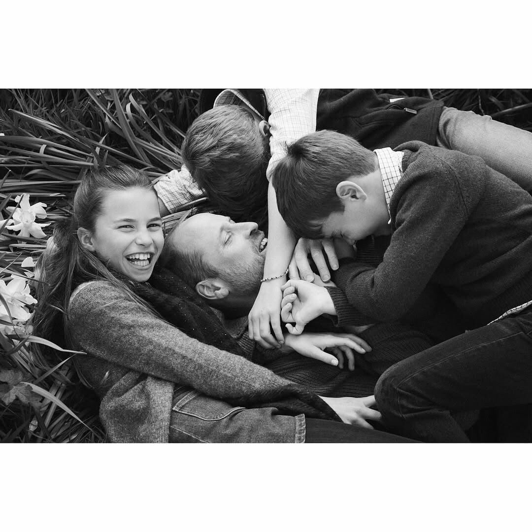 Η φωτογραφία, η οποία τραβήχτηκε κατά τη διάρκεια μιας οικογενειακής φωτογράφισης που ο Γουίλιαμ και η Κέιτ έχουν μοιραστεί πολλές φορές μέσα στη χρονιά, είναι ένα αυθόρμητο ασπρόμαυρο στιγμιότυπο με τον πρίγκιπα Γουίλιαμ ξαπλωμένο στο έδαφος, περιτριγυρισμένο από τα χαμογελαστά παιδιά του.