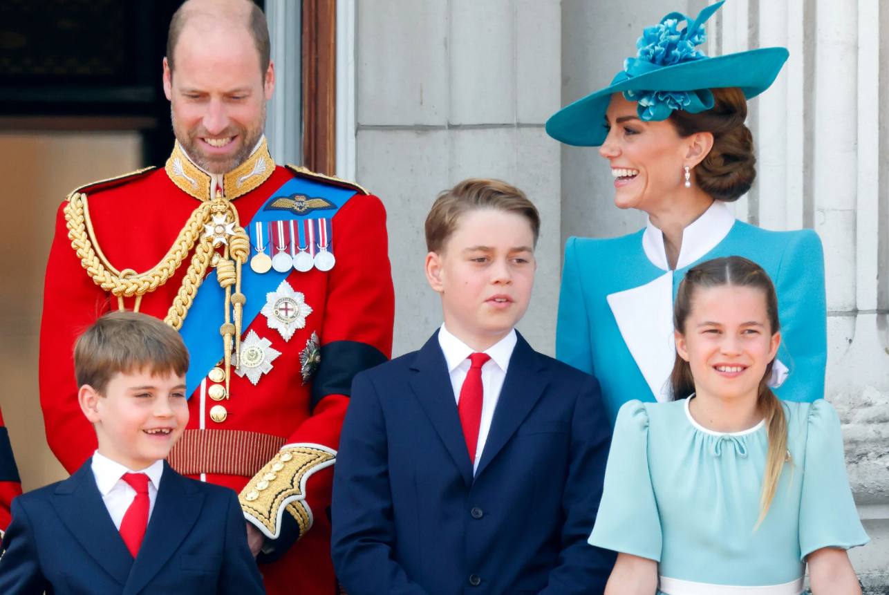 Η πριγκίπισσα Σάρλοτ, 10 ετών, χαμογελά προς τον φακό, ενώ τα αδέλφια της, ο πρίγκιπας Τζορτζ, 12 ετών, και ο πρίγκιπας Λούις, 7 ετών, έχουν στραμμένα τα πρόσωπά τους προς τον πατέρα τους.